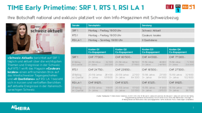 Ihre TIME Spot-Platzierung erfolgt unmittelbar vor den wichtigen Informationssendungen auf den Sendern SRF 1, RTS 1 und RSI LA 1 in einer Länge von zehn Sekunden und verschafft Ihrem Spot die volle Aufmerksamkeit des Publikums.