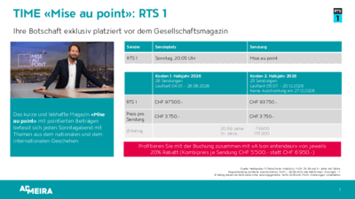 Profitieren Sie mit der Buchung von TIME Mise au point von der höchsten Werbewirkung im Umfeld eines Programmes von höchster Glaubwürdigkeit!