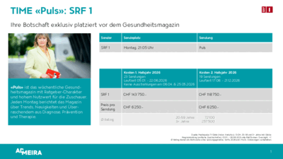 Ihre TIME Spot-Platzierung erfolgt unmittelbar vor dem Gesundhaitsmagazin auf dem Sender SRF 1 in einer Länge von zehn Sekunden und verschafft Ihrem Spot die volle Aufmerksamkeit des Publikums.