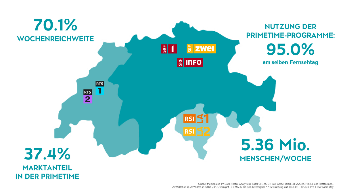 Reichweite: Die Sender der SRG erreichen einen grossen Teil der Bevölkerung in allen Landesteilen und -sprachen der Schweiz. Dies ermöglicht nicht nur sprachregionale, sondern auch nationale Werbekampagnen.