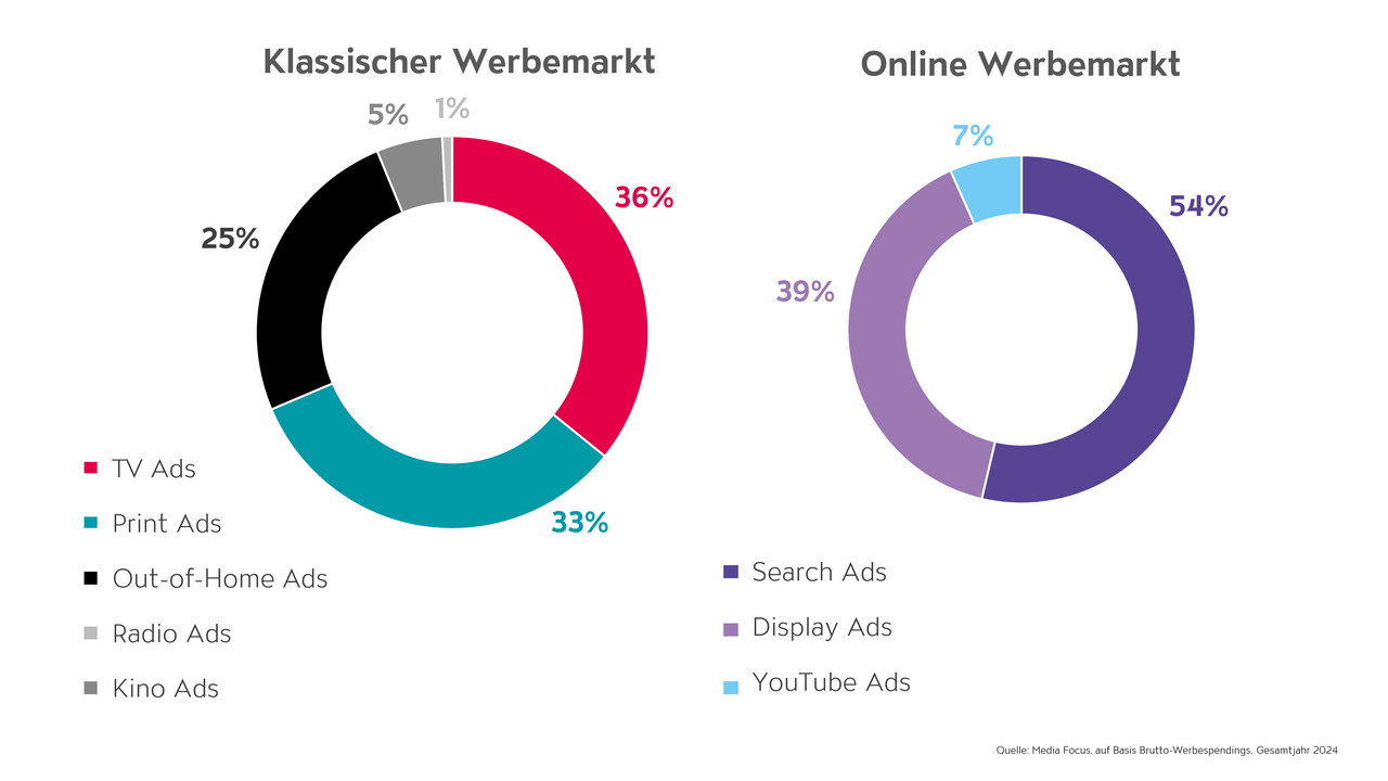 Werbespendings: Im Intermedia-Vergleich wurden im Jahr 2024 in der Schweiz mit 36% einer der grössten Werbeausgaben in der Gattung TV platziert.