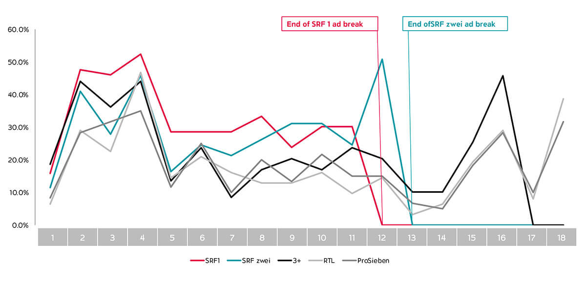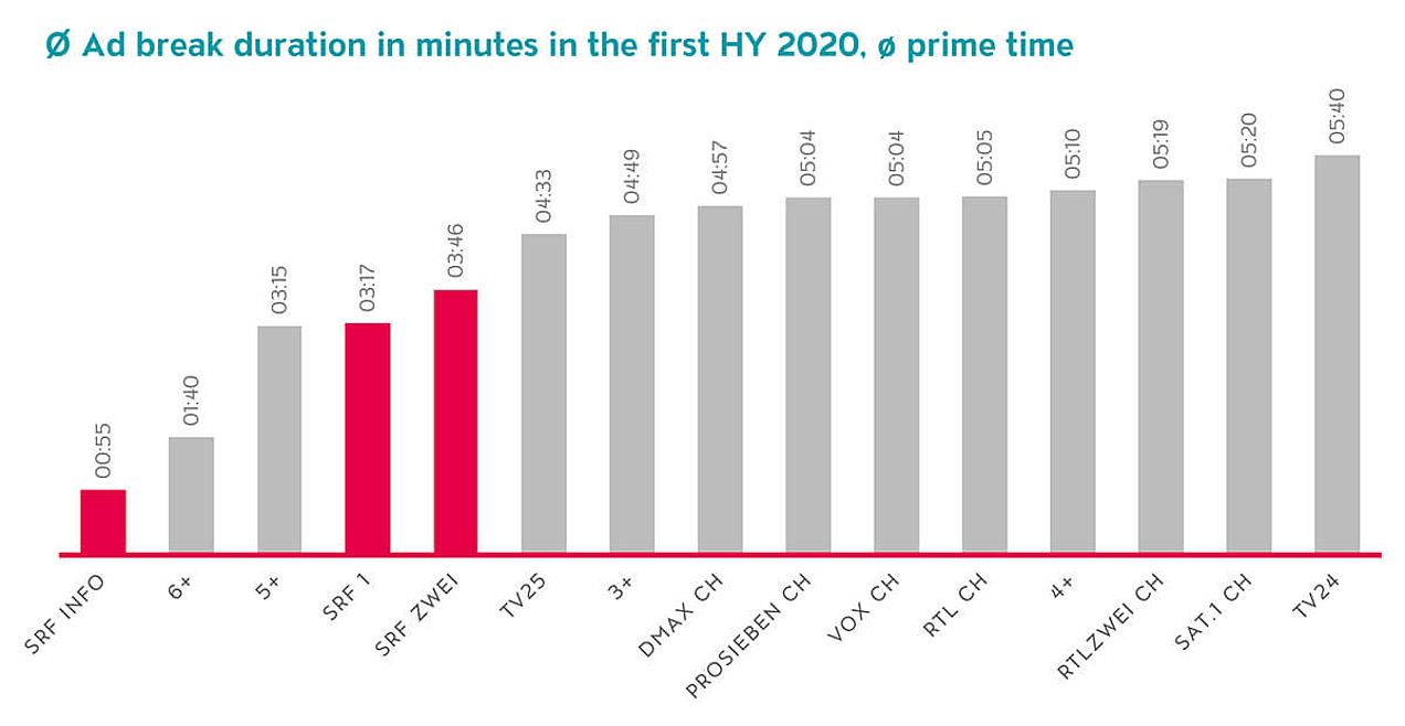 - Ad break length: SRF broadcasters have significantly shorter ad breaks than comparable TV channels (Figure 1) .