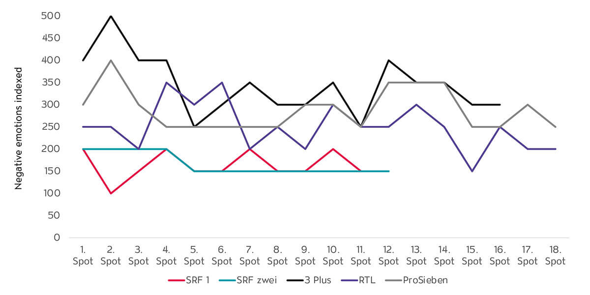 The survey once again confirms the high-quality broadcaster environment and the high level of advertising impression in the experimental groups of SRF broadcasters. The results of facial coding can be used to identify the impact of the increased level of advertising impression in practice. The subjects who watched programmes on SRF 1 and SRF zwei in advance showed significantly lower advertising acceptance for the same TV spots. SRF ad breaks elicit around 80% fewer negative emotions. It is also clear that the initial emotional situation amongst the SRF experimental groups was much better at the very first spot. This is a clear indication of the advertising impact of the broadcaster environment (Figure 3).
