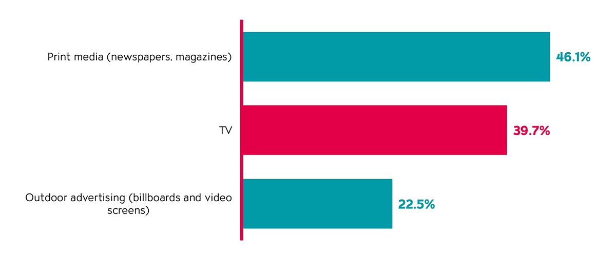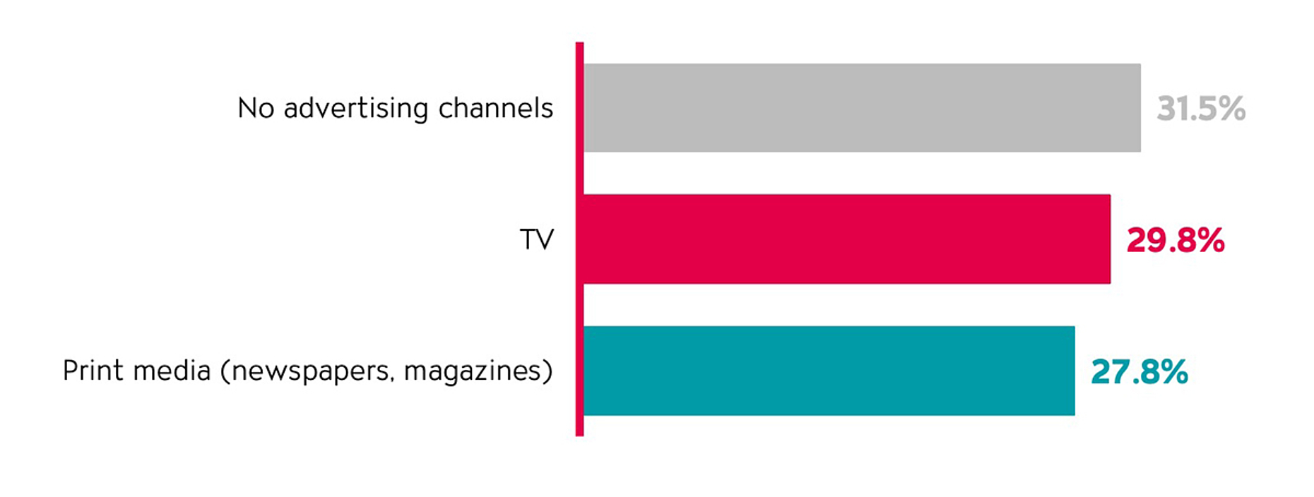 The study examined two psychological effects of advertising (‘influence on purchasing decision’ and ‘credibility of advertising’), across all media channels. Two media channels stand out, in particular: TV and print media. These two advertising channels performed best in terms of the two psychological effects studied.