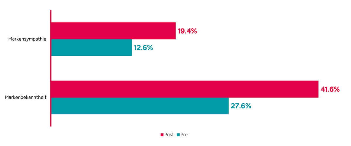 Dass die Marke cbuy.ch breit wahrgenommen wurde, ist die Grundvoraussetzung für Marketing-Effekte. Auch diese konnten erreicht werden. Die gestützte Markenbekanntheit von cbuy.ch steigt von 28% auf 42%. Gleichzeitig steigt auch die Top 2 der Markensympathie - also Personen welche die Marke sehr oder eher sympathisch finden - von 13% auf 19% (siehe Abb. 1). Dies bedeutet, dass es der TV-Kampagne nicht nur gelungen ist, die Marke bekannter zu machen, die Marke gewann auch an qualitativem Wert.