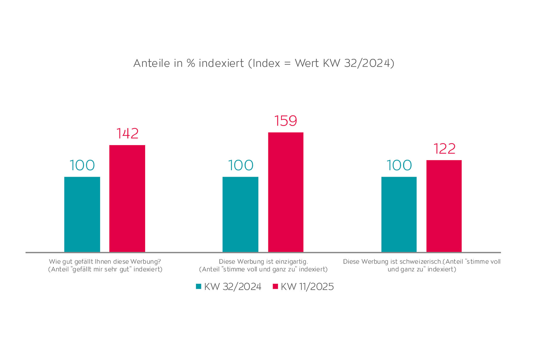 Die Zustimmung zur Aussage «Diese Werbung ist schweizerisch» nahm besonders stark zu. Insgesamt stimmten 93% der Befragten dieser Aussage beim optimierten Spot zu. Allein die Nennungen der höchsten Zustimmung («stimme voll und ganz zu») kletterten von 55% auf 67% (Index 122). Dieser Fokus auf die Schweizer Bildwelt ist ein wichtiger kreativer Faktor, da Spots mit Swissness in Bezug auf die anderen Bewertungsdimensionen Einzigartigkeit und Akzeptanz zu rund einem Drittel besser beurteilt werden als jene ohne.2