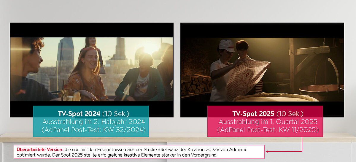 Im Rahmen des AdPanels wurden in der Deutschschweiz zwei Spots von Emmentaler AOP analysiert, die in unterschiedlichen Zeiträumen ausgestrahlt wurden. Zwischen den beiden Wellen wurde der TV-Spot gezielt optimiert. Die Anpassungen basierten unter anderem auf Erkenntnissen aus der Admeira Studie «Relevanz der Spot-Kreation». Diese Studie belegt, dass Spots, die eine Schweizer Bildwelt (Swissness) nutzen, deutlich besser beurteilt werden als jene ohne diesen Bezug.2 Aufgrund dieser Daten stellte der Spot 2025 erfolgreiche kreative Elemente wie Herkunft und Tradition stärker in den Vordergrund.