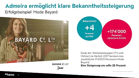Auf den Kanälen von Admeira Werbung zu betreiben, zahlt sich aus. Das zeigen mehrere Kampagnen der vergangenen Jahre, die mit Pre- und Posttests analysiert wurden. Entdecken Sie einige der Erfolgsbeispiele und sehen Sie, wie renommierte Brands Image, Bekanntheit und Verkäufe deutlich steigern konnten