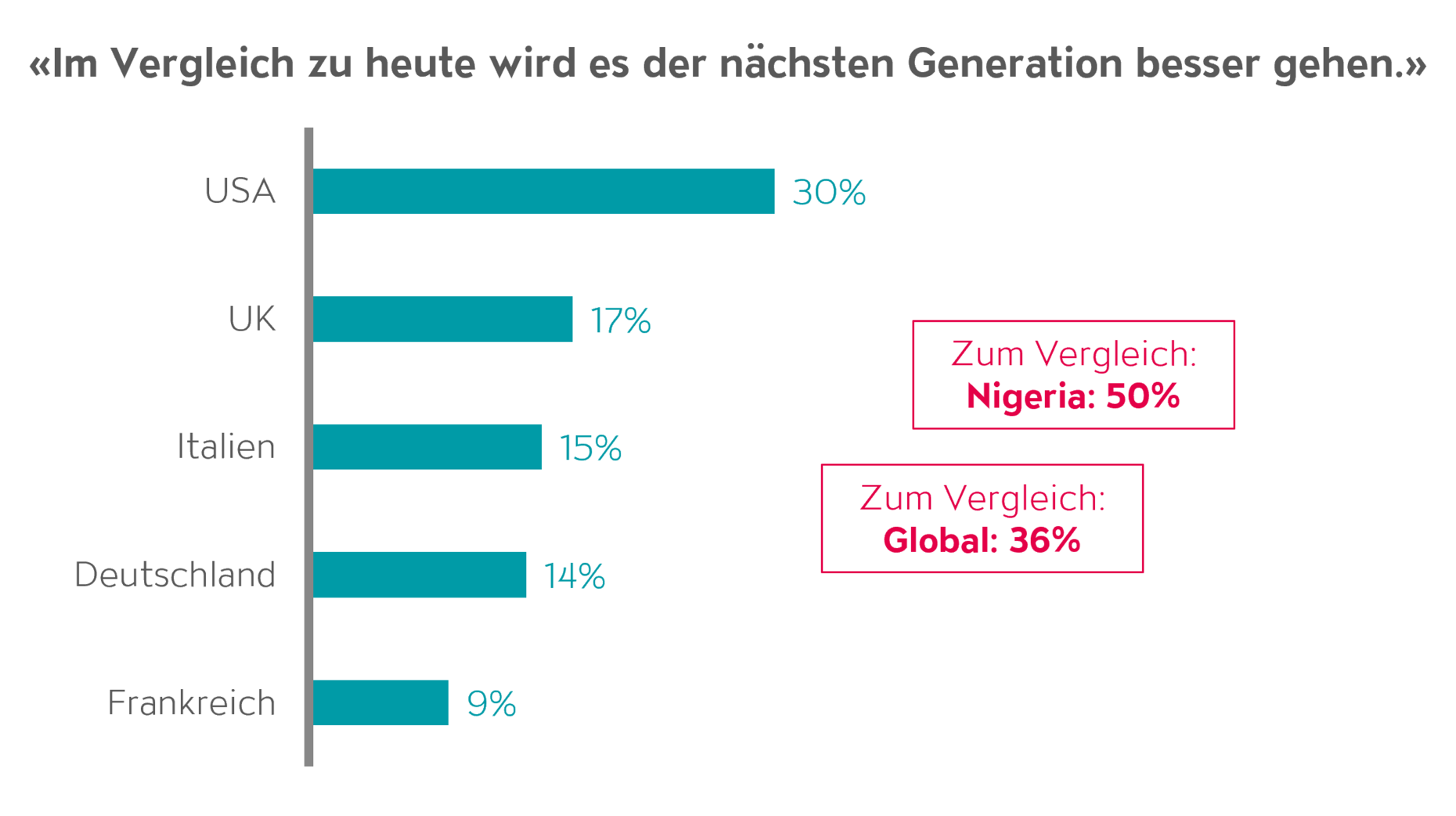 Die allgemeine Skepsis schlägt sich auch in mangelndem Optimismus für die Zukunft nieder. Global glauben nur 36% der Befragten, dass es der nächsten Generation besser gehen wird als der heutigen. In den meisten Industrieländern ist dieser Wert sogar noch niedriger; beispielsweise sind in Frankreich nur 9%, in Deutschland 14%, in Italien 15%, in Grossbritannien 17% und in den USA 30% optimistisch für die folgende Generation. Im Gegensatz dazu ist der Optimismus in Ländern wie Nigeria mit 50% höher.