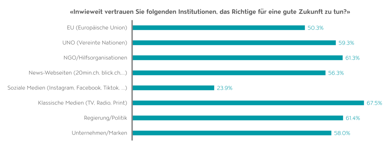 Bei den verschiedenen Nachrichtenkanälen geniesst Social Media mit nur 42% das geringste Vertrauen. Der Wert ist im Vergleich zu 2023 sogar um 2 Prozentpunkte gesunken. Im Gegensatz zu den globalen Trends des Edelman Trust Barometers zeigt das Admeira AdPanel – unser eigenes Forschungsinstrument für AdHoc Forschungsthemen und Werbewirkungsforschung – ein differenziertes Bild für die Schweiz, insbesondere hinsichtlich der Medien. Die Studie «Future Trust Level» untersuchte das Vertrauen der Deutschschweizer in Institutionen, «das Richtige für eine gute Zukunft zu tun». Hierbei ergab sich, dass klassische Medien (TV, Radio, Print) mit 67.5% das höchste Zukunftsvertrauen geniessen. News-Webseiten folgen mit 56.3% Vertrauen, während soziale Medien (Instagram, Facebook, Tiktok, etc.) mit nur 23.9% das geringste Vertrauen für die Zukunft aufweisen. Unternehmen/Marken weisen in dieser Erhebung ein Zukunftsvertrauen von 58.0% auf (Abb. 3).