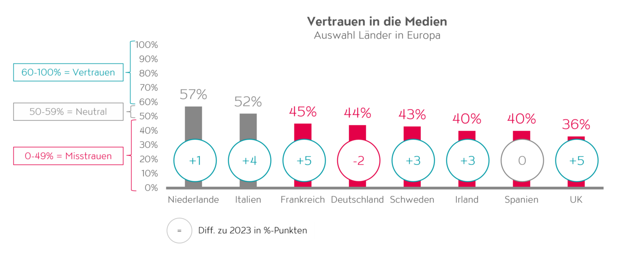 Das Vertrauen in die Medien ist weltweit eher gering. Eine Mehrheit der Befragten glaubt, dass Medien lieber ein möglichst grosses Publikum anziehen, anstatt der Bevölkerung zu sagen, was sie wissen müssen (58%). Ebenso sind 53% der Meinung, dass Medien eine Ideologie unterstützen, anstatt die Öffentlichkeit zu informieren. Weltweit herrscht in 14 von 28 Ländern Misstrauen gegenüber den Medien. Auch in Europa ist das Vertrauen in Medien niedrig, mit Werten von 57% in den Niederlanden, 52% in Italien, 45% in Frankreich und 44% in Deutschland. Im weltweiten Durchschnitt liegt das Vertrauen in Medien bei 52%, was eine Verbesserung um 2 Prozentpunkte seit 2023 bedeutet (siehe Abb. 2).