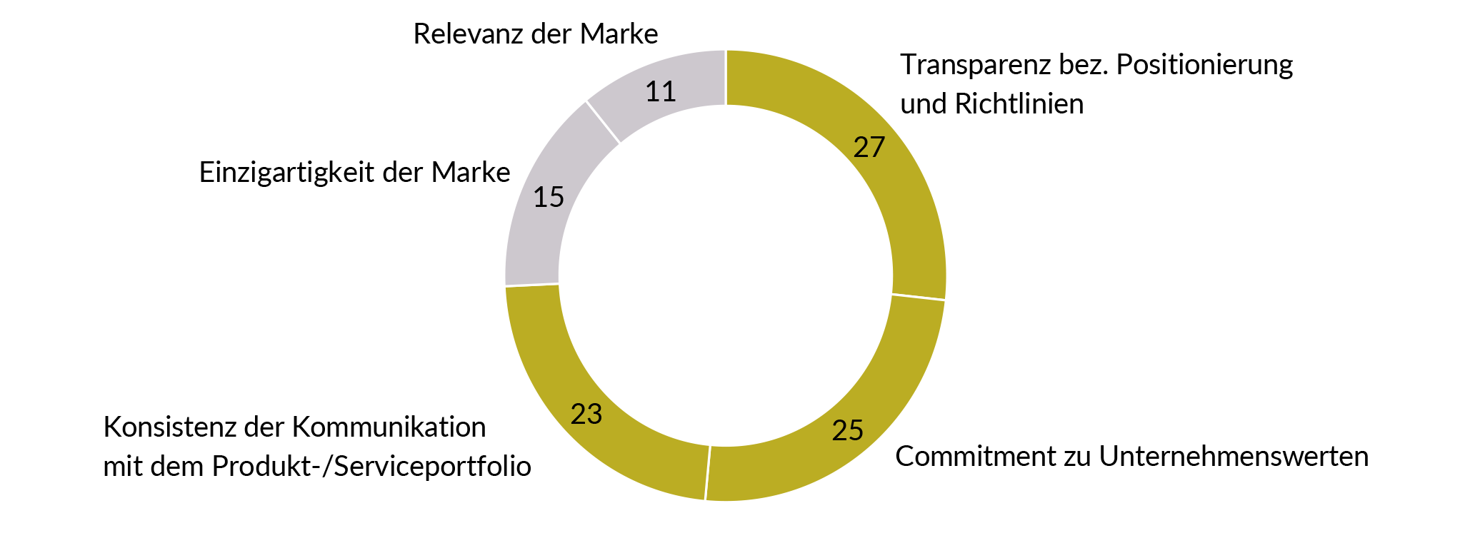Bleibt in den Top 3 noch das Schwerpunktthema «Authentizität», welches neben der hohen Relevanz von vielen Marketingverantwortlichen auch mit hohem Handlungsbedarf bewertet wird. Dabei wurden verschiedene Dimensionen der Authentizität priorisiert. Am wichtigsten werden Transparenz bezüglich Positionierung und Richtlinien, Commitment zu Unternehmenswerten und Konsistenz der Kommunikation eingeschätzt (Abb. 3). Alles Aspekte, welche mit einer konsistenten Breitenkommunikation erreicht werden können.