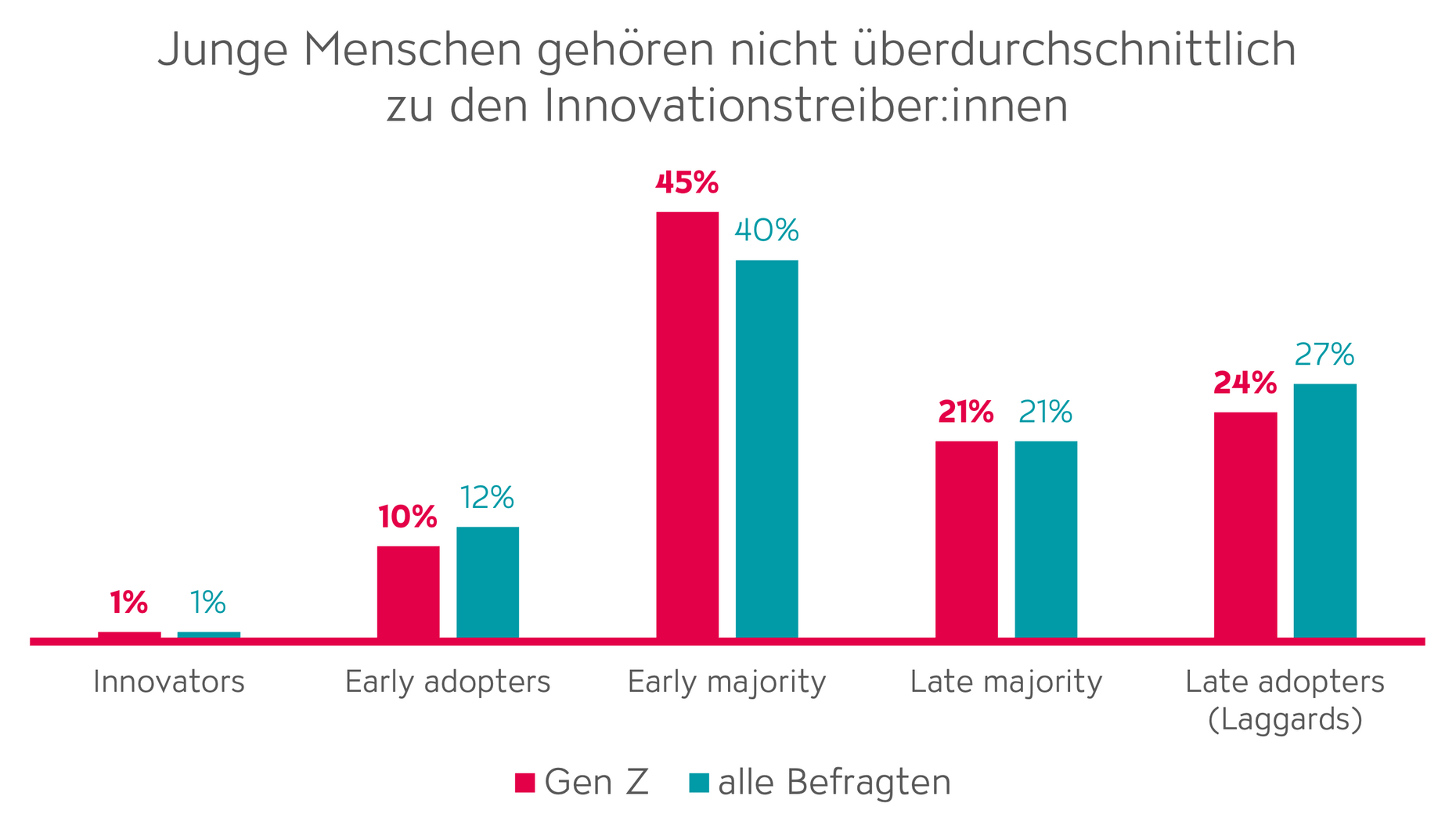 Beim Konsumverhalten lässt sich feststellen, dass sich nur knapp ein Drittel der jungen Generation beim Kauf von Produkten von Prominenten oder Influencer:innen als Testimonial beeinflussen lassen. Erstaunlich mag sein, dass mit 45% überproportional viele Personen der Gen Z zum Konsumententyp «Frühe Mehrheit» (early majority) gezählt werden (siehe Abb. 4). Diese Kategorie umfasst jene Personen, die Innovationen nach einer gewissen Zeit und erst nach sorgfältiger Überprüfung übernehmen. Innovation wird also nicht wie vermutet überdurchschnittlich durch die junge Generation angestossen.