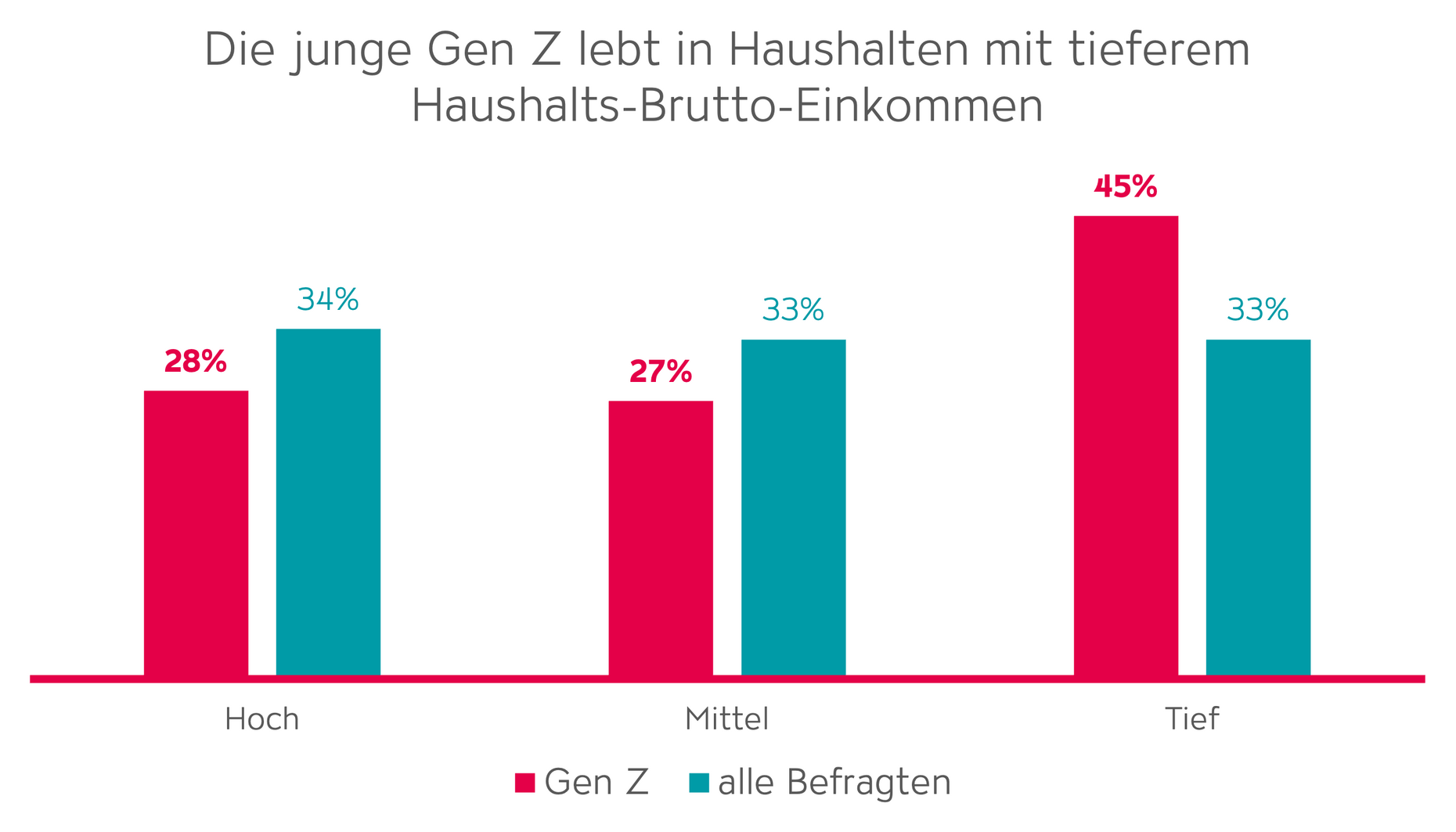 Unter den Befragten (18-64 Jahre) gehören nur 20% zur Gen Z (siehe Abb. 1). Dies entspricht einer eher kleinen Zielgruppe. Fast die Hälfte der Menschen in dieser Generation lebt in einem Haushalt mit einem niedrigen Bruttoeinkommen (siehe Abb. 2). Darüber hinaus leben 42% mit ihren Eltern oder anderen erwachsenen Verwandten im gleichen Haushalt und zwar doppelt so viele in Kleinstädten und ländlichen Gemeinden als in Grossstädten. 10% von ihnen sehen sich als Teil der LGBTQ+ Gemeinschaft.