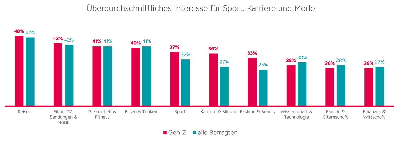 Eine glückliche Beziehung und eine gute Zeit zu haben, ist sowohl für die Gen Z als auch für alle anderen Menschen ab 18 Jahren einer der wichtigsten Aspekte im Leben. Die junge Generation Z setzt sich aber deutlich mehr unter Druck, erfolgreich zu sein. Nicht verwunderlich ist es deshalb, dass Karriere, Bildung und Sport innerhalb der sechs wichtigsten persönlichen Interessen zu finden sind. Die meistgenannten Interessen sind bei allen Altersklassen Reisen sowie Filme/TV-Shows schauen und Musik hören (siehe Abb. 3).