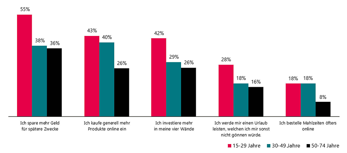 31% der befragten Personen haben ihre Gewohnheiten insofern verändert, dass sie mehr Geld in die eigenen vier Wände investieren, was den Cocooning-Trend erneut bestätigt. Besonders bemerkenswert ist jedoch auch, dass 42% angeben, dass sie Geld für spätere Zwecke zurücklegen. Zu dieser Gruppe mit Nachholpotential gesellt sich mehr als jede zweite Person zwischen 15 und 29 Jahren dazu.