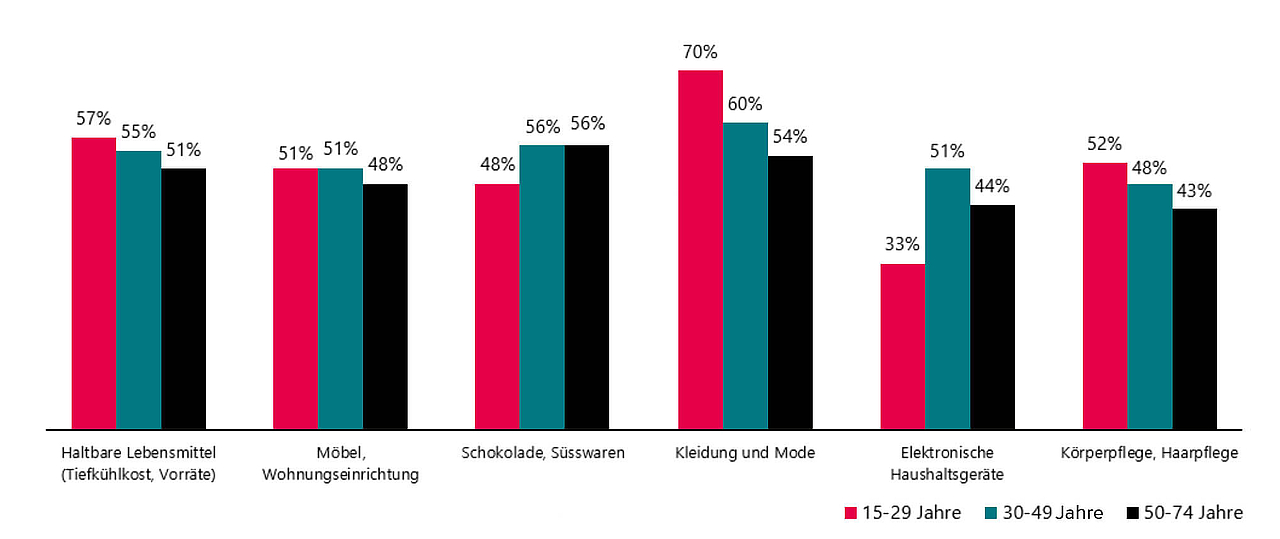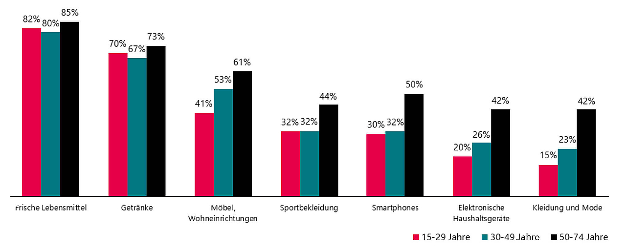 So würde beispielsweise jede dritte Person Sportbekleidung und Smartphones im stationären Handel einkaufen wollen, um von der entsprechenden Fachberatung profitieren zu können. In diesen beiden Produktkategorien ist auch deutlich zu erkennen, dass ältere Personen den stationären Handel deutlich bevorzugen. Die Vermutung, dass sich das ganze Einkaufsverhalten in digitale Kanäle verschieben wird, bleibt daher für viele Produktkategorien wohl eher unrealistisch.