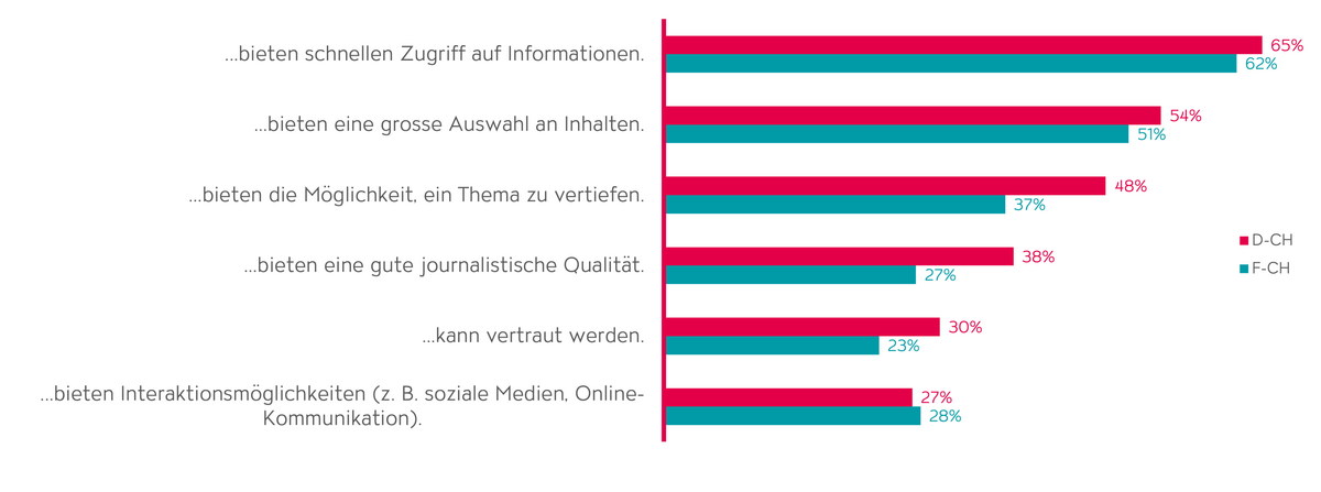 In der Studie wurde gefragt, welche Aspekte bei der Mediennutzung eine wichtige Rolle spielen. Dabei wurde klar, dass bei ca. zwei Drittel aller Teilnehmer:innen der schnelle Zugriff auf Informationen und für etwas mehr als die Hälfte eine grosse Auswahl an Inhalten sehr relevant sind. Interaktionsmöglichkeiten mit Medien werden als deutlich weniger wichtig erachtet.