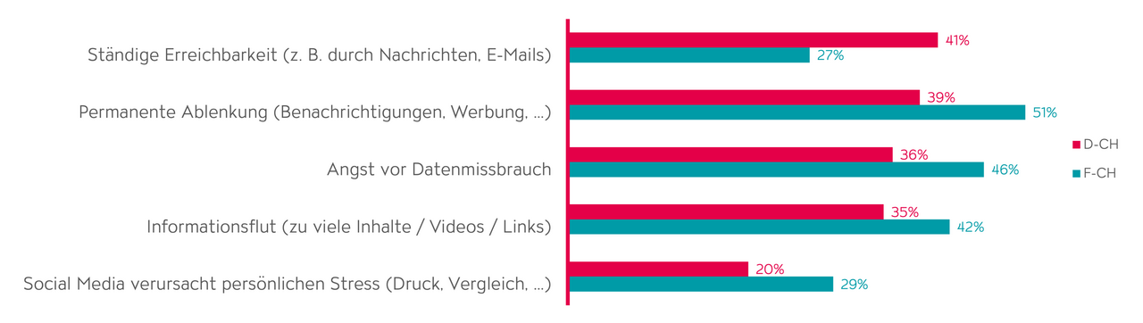 Vor allem in der Deutschschweiz zeigt sich deutlich, dass die permanente Erreichbarkeit im Internet durch Nachrichten, E-Mails etc. und die daraus entstehende ständige Ablenkung die Menschen am meisten überfordern. In der Westschweiz beurteilen zudem rund knapp die Hälfte aller Befragten die Angst vor Datenmissbrauch als wichtigen Aspekt der Überforderung. Zu viel Informationsflut und persönlicher Druck auf Social Media gehören ebenso zu den Fakten der Internet-Überforderung (Abb. 2).