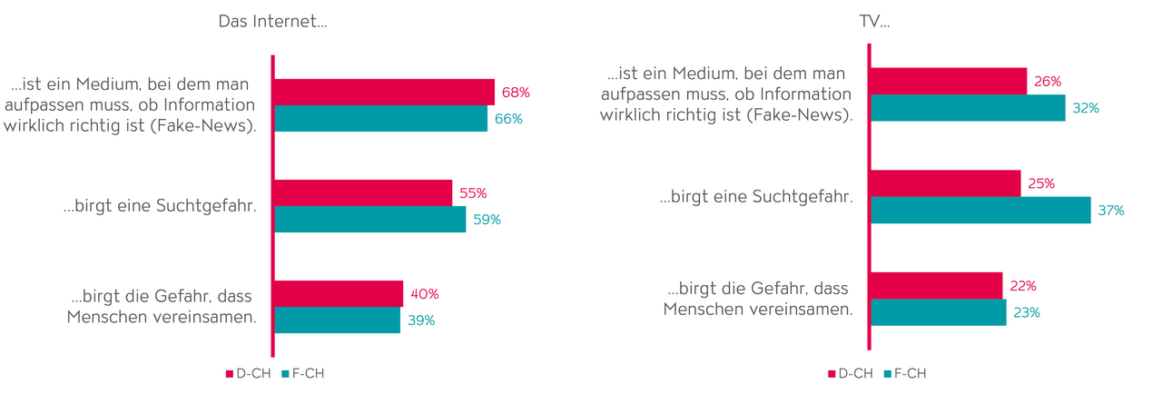 Der Vergleich zwischen dem Medium Internet und dem Medium TV zeigt dann auch, dass Risiken wie Suchtgefahr, Einsamkeit und die Verbreitung von Fake-News im Internet mehr als doppelt so hoch beurteilt werden als im TV. Fernsehen bietet im Gegensatz zum Internet eine selbstbestimmte Möglichkeit, sich zu informieren oder zu entspannen, ohne dauerhafte Ablenkung. Dies bestätigt die positiven Eigenschaften des Fernsehens als Lean-Back-Medium.