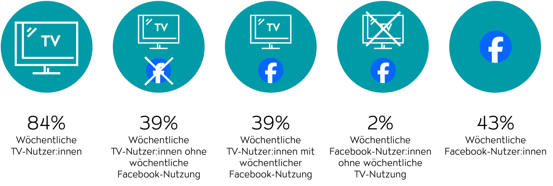 Facebook ist mit insgesamt 43% wöchentlicher Durchdringung eine weniger starke Plattform als Instagram. Dies führt auch dazu, dass die Strategie von TV-Kontakten mit nachgelagerten Facebook-Kontakten nur 39% potentielle Wochenreichweite (15-75 Jahre) erzielen kann. Mit nur 4%, die als Streuverluste nicht mit einem vorgelagerten TV-Kontakt abgesichert werden können, ist Facebook jedoch durchaus interessant (Abb. 3).