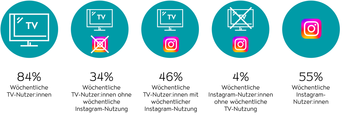 Eine Kampagne mit TV-Kontakten in Kombination mit nachgelagerten Instagram-Kontakten (Reaktivierung der Erinnerung über Instagram) kann eine maximale wöchentliche Durchdringung der Gesamtpopulation (15-75 Jahre) von 46% erreichen. Dazu können Streuverluste auf Instagram bei 9% der Zielgruppe entstehen. Bei diesen 9% der Personen, die nur über Instagram erreichbar sind, kann die Werbewirkung nicht mit einem vorgelagerten TV-Kontakt abgesichert werden (Abb. 2).