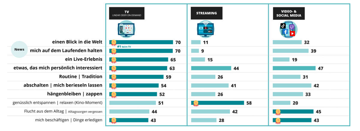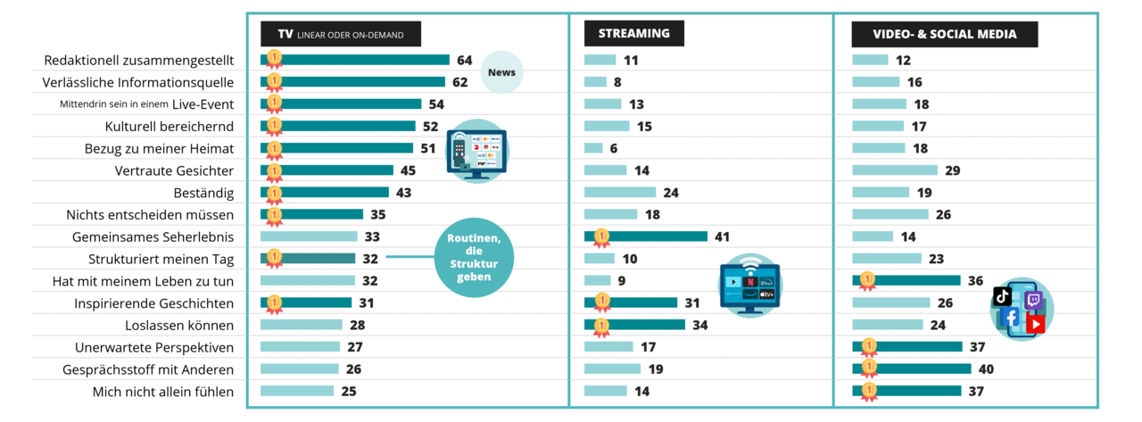 - Führend bei Unterhaltung und Information: TV erfüllt zentrale Bedürfnisse, insbesondere den Wunsch, auf dem Laufenden zu bleiben oder Live-Events zu erleben. Die Zuschauer:innen vertrauen auf die redaktionelle Qualität und Seriosität.