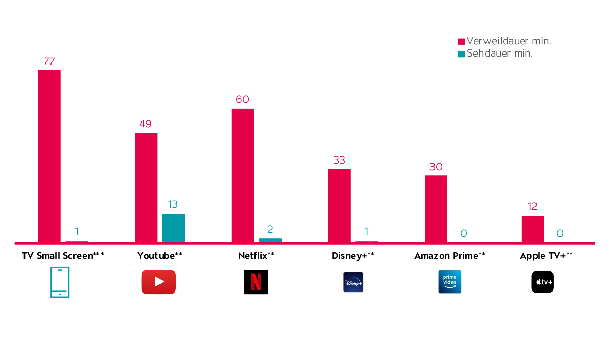 Auf den Small Screens schneidet YouTube besser ab. Von den ausgewiesenen 17,7 Minuten pro Kopf pro Tag Small-Screen-Nutzung (Sehdauer) entfallen 13 Minuten auf YouTube. Hier hat YouTube eine grössere Nutzerbasis, was zu mehr Sehdauer führt. Die Verweildauer pro Nutzer:in von 49 Minuten ist bei YouTube aber auch auf dem Small Screen unterdurchschnittlich.