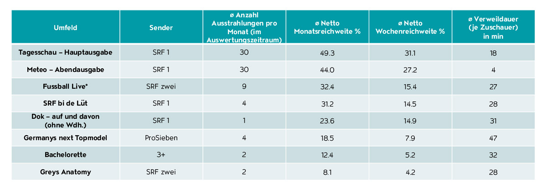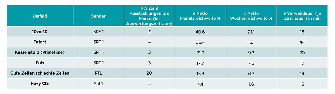 Formate mit einer hohen Ausstrahlungsfrequenz, einer hohen Nutzungsfrequenz und einer langen Dauer des Formats steigen bei der Nutzungsdauer in der Relevanz. Die täglich ausgestrahlte «Tagesschau» mit einer Monatsreichweite von 49.3%, einer Wochenreichweite von 31.1% und einer Verweildauer von 18 Minuten, bindet eine:n Deutschweizer:in stark. Für hohe Aufmerksamkeit sind solch hohe Werte in der Frequenz eine hervorragende Grundlage.