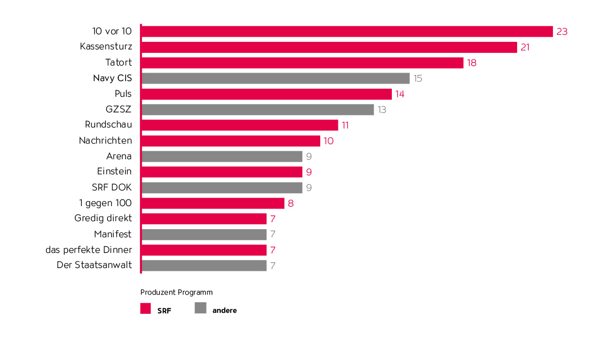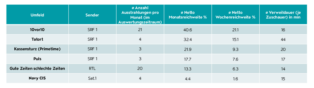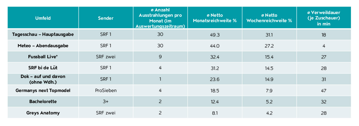 Die Top 6 der Bewegtbildformate stammen alle aus dem Admeira Portfolio. Es sind mit der «Tagesschau» (47% abgefragte Verbreitung), «Meteo» (46%), «Auf und Davon» (30%), «SRF bi de Lüt» (29%), Fussball auf SRF zwei (29%) sowie «Hin und weg» (21%) allesamt Produktionen der SRG. Das Format «Tagesschau» erreicht fast jede:n zweite:n Schweizer:in.