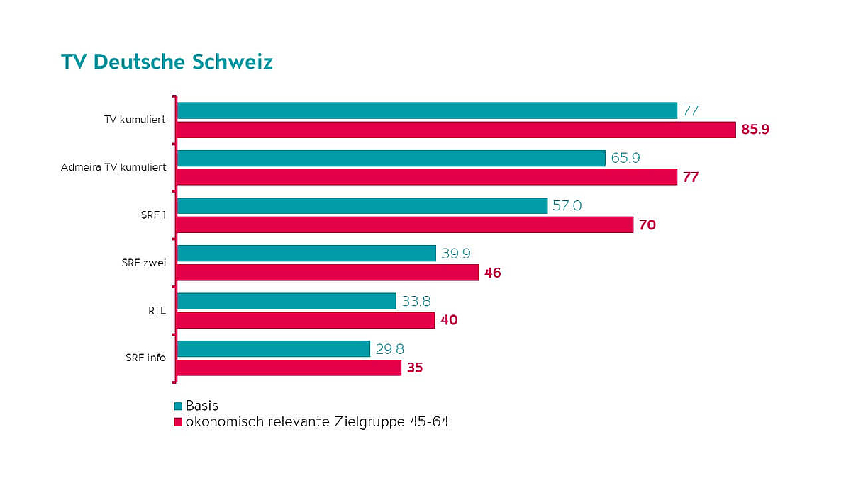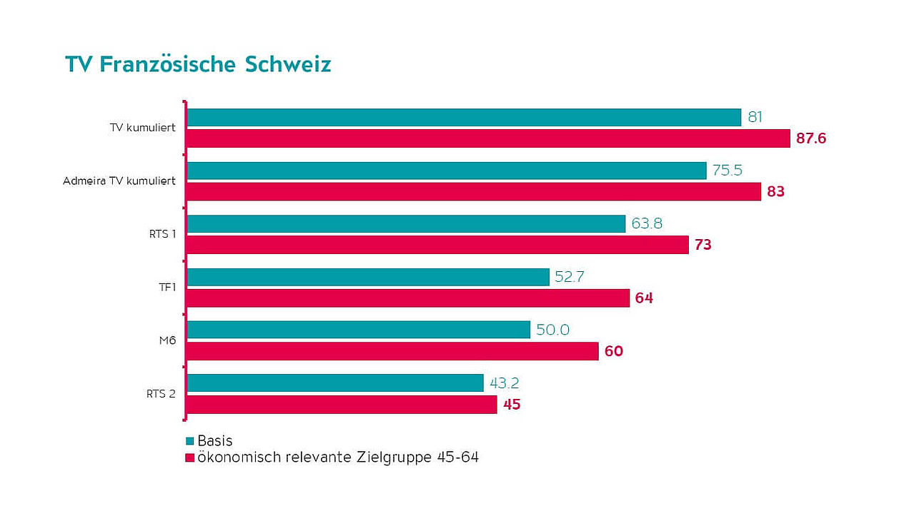 Die Reichweiten des Admeira TV-Portfolios liegt bei starken 66% mehrmals wöchentlicher Nutzung in der deutschen Schweiz. In der Romandie liegt die Reichweite sogar bei 76%. Und in der ROI-Zielgruppe (45-64 Jahre) fallen die Reichweiten des Admeira Portfolios noch besser.