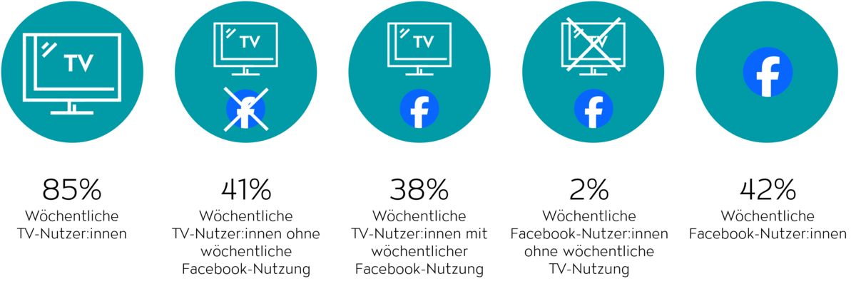 Obwohl Facebook mit einer wöchentlichen Durchdringung von 42 % (−1 %-Pt. ggü. Vorjahr) insgesamt etwas schwächer abschneidet als Instagram, bietet die Plattform spezifische Vorteile. Die Strategie «TV first, Facebook second» erreicht 38 % der Population pro Woche. Bemerkenswert ist hier der sehr geringe Anteil an ungesicherten Kontakten von nur 2 %.