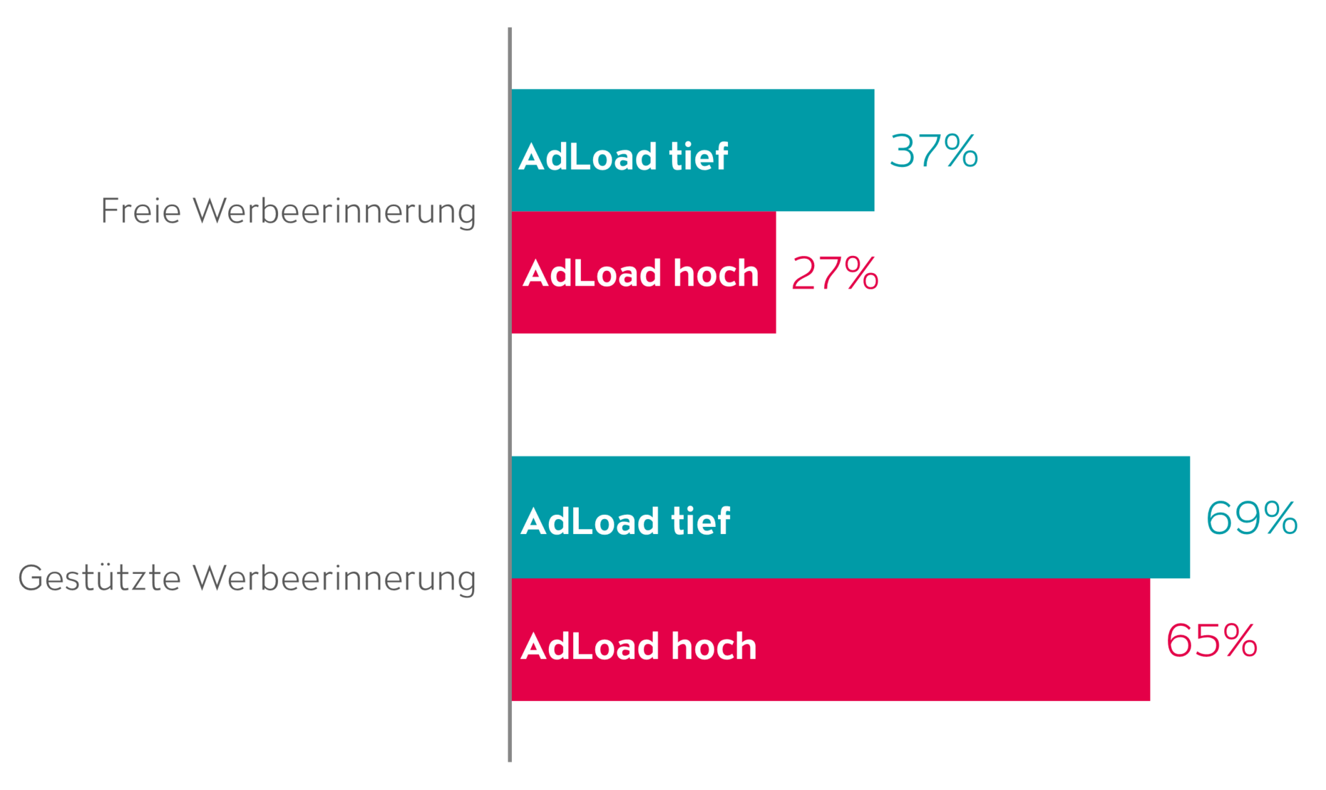- Die freie Werbeerinnerung (ungestützter Recall) liegt bei tiefem AdLoad um 37 % höher (+10 %-Pt.) als bei langen Werbeblöcken.