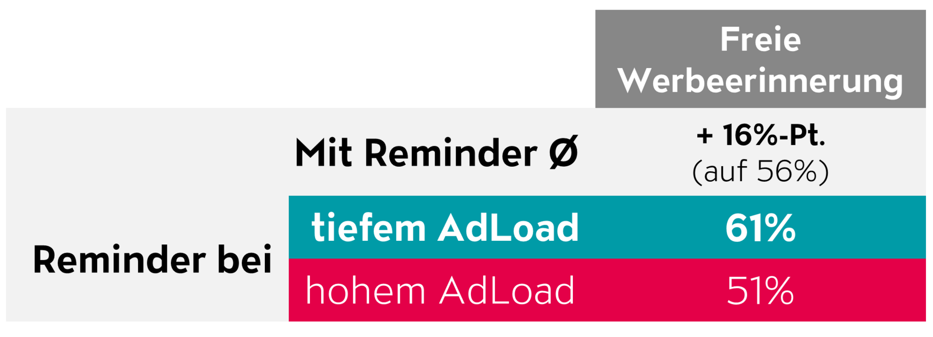 - Die freie Werbeerinnerung steigt mit Reminder um 41 % (+16 %-Pt.).