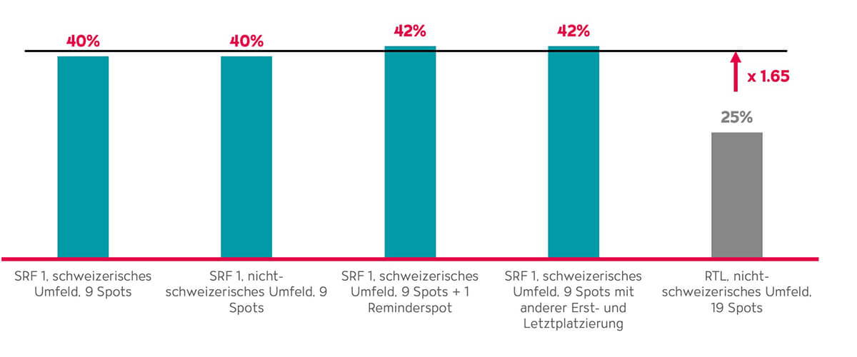 Auf das Programmumfeld bezogen, zeigen sich keine generellen Effekte. Zwischen SRF 1 mit Schweizer Programmumfeld («Landfrauenküche») und SRF1 mit nicht-schweizer Programmumfeld («Der Ranger») liegt der durchschnittliche Recall zwischen 40% und 42% (Gruppen 1 bis 4).