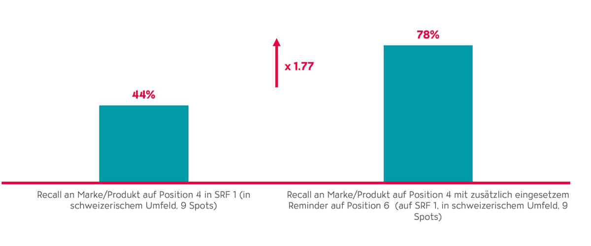 Die Erst- und Letztplatzierungen sowie der Einsatz eines Reminder-Spots verbessern vor allem die Erinnerung an die Marke. Dies ist besonders für Werbetreibende interessant, deren primäres Ziel die Steigerung der Markenbekanntheit ist. Auf Kreationsebene erinnert sich das Publikum am besten an Spots, welche es zugleich als schweizerisch und einzigartig bewertet. Dieser Effekt lässt sich nicht nur generell, sondern auch im SRF Senderumfeld sowie im Programmumfeld schweizerischer SRF Sendungen signifikant nachweisen.