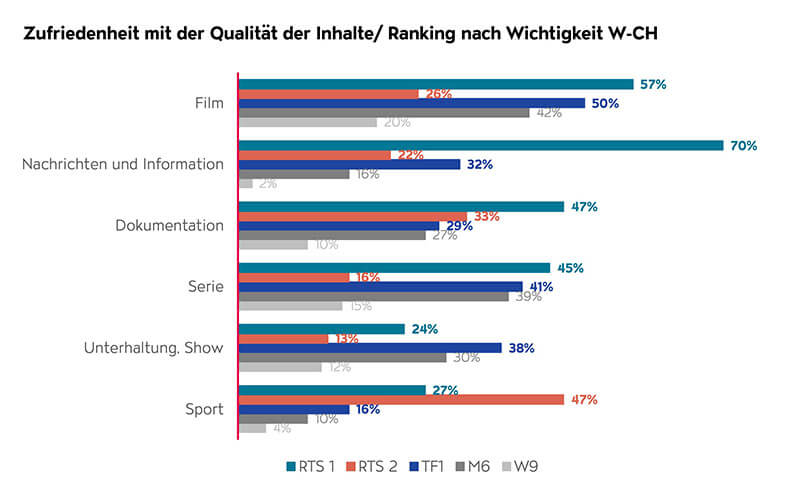 Ebenso erfahren die von Admeira vermarkteten Premium-Sender in der Romandie eine sehr gute Bewertung. In den vier beliebtesten Genres landet RTS auf dem ersten Platz bei der Beurteilung nach Zufriedenheit mit der Qualität der Inhalte. TF1 wird bei allen Genres besser bewertet als die Konkurrenz (siehe Abb. 2).