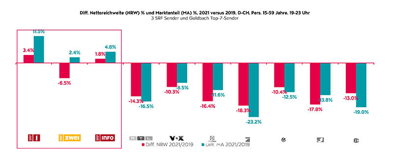 Das Bedürfnis an Swissness im TV steigt. Zum einen ist das Interesse an Schweizer Sendungen, Filmen und Serien gestiegen, des Weiteren erleben Schweizer TV-Sender einen weiteren Vertrauensschub. Insbesondere im Sendeformat Nachrichten ist das Vertrauen in eine neutrale Berichterstattung nochmals gestiegen. Es gibt durchaus private Sender, die ein relevantes News-Angebot aufweisen, doch im Nutzungsvergleich zu «vor Corona 2019» wird deutlich, dass nur SRF bei Sendern mit relevanten News-Umfeldern bei Marktanteil und Nettoreichweite zulegen kann.