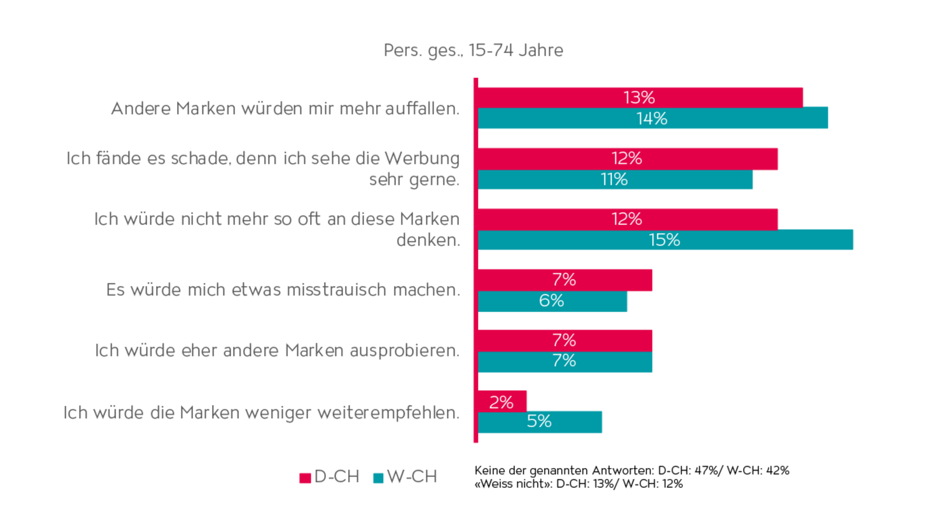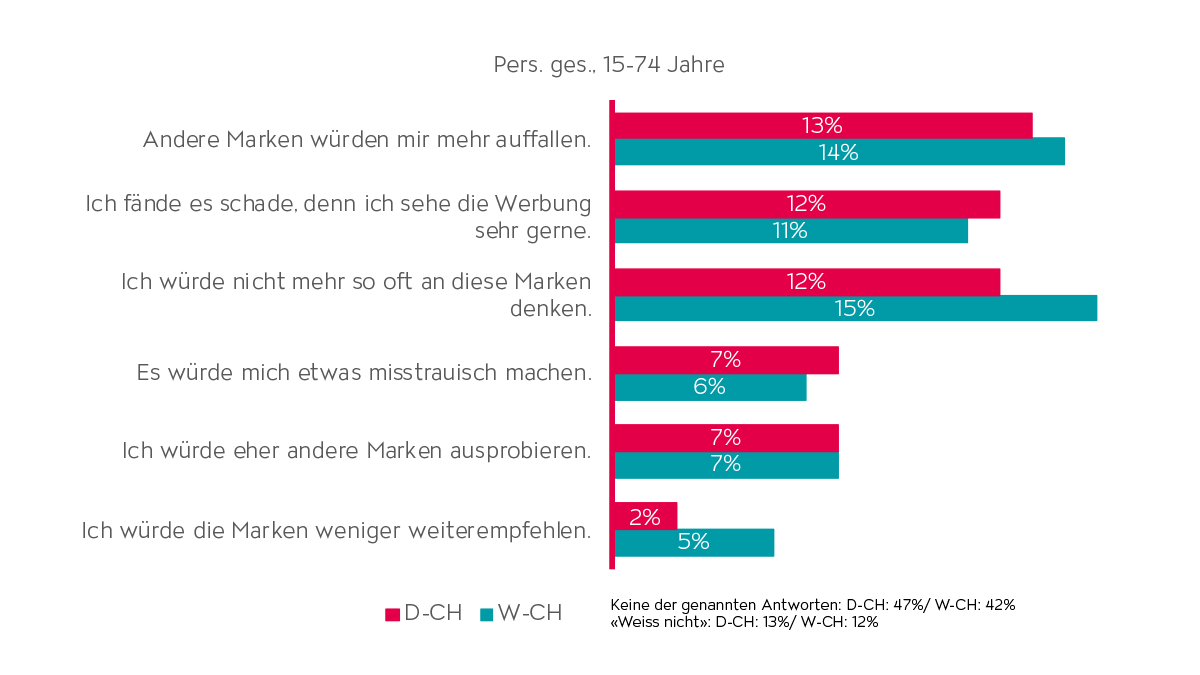 Falls sich ein:e Werbeauftraggeber:in überlegen sollte,viel weniger in Werbung zu investieren und die Marke viel weniger stark in der Werbung zu sehen wäre, muss damit gerechnet werden, dass sich ungefähr 15% der Menschen in der Deutsch- und Westschweiz eher anderen Marken zuwenden und nicht mehr so oft an diese Marke denken würden. Konsument:innen fühlen sich emotional verbunden mit dem Brand und sehen die Werbung deshalb auch gerne. Einige wären sogar misstrauisch gegenüber einer Marke ohne sichtbare Werbung (siehe Abb. 1).