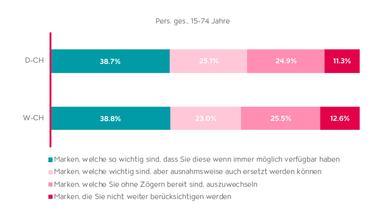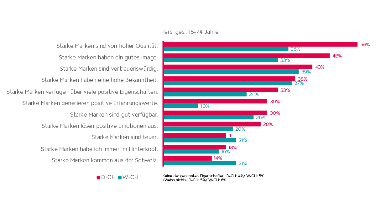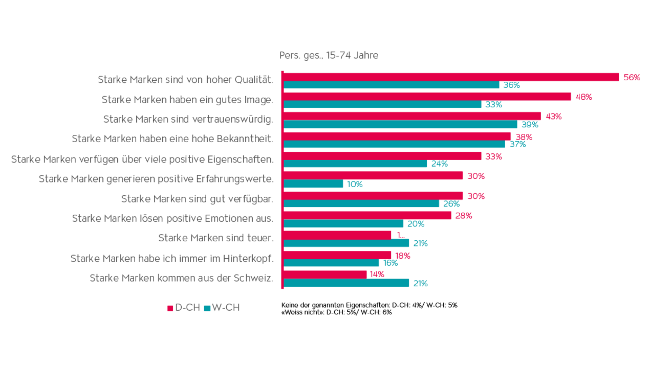 Wie schaffen es Marken also, zu den 40% der unersetzlichen Marken zu gehören, welche Konsument:innen immer verfügbar haben möchten? In der Studie wurden die Teilnehmer:innen gefragt, was eine starke Marke denn ausmacht. In der Deutschschweiz gehören hohe Qualität, gutes Image, Vertrauenswürdigkeit, hohe Bekanntheit und viele positive Eigenschaftenzu den wichtigsten Aspekten einer starken Marke.In der Westschweiz liegt die Vertrauenswürdigkeit einer Marke an erster Stelle, gefolgt von hoher Bekanntheit, hoher Qualität, gutem Image und einer guten Verfügbarkeit (Abb. 4).