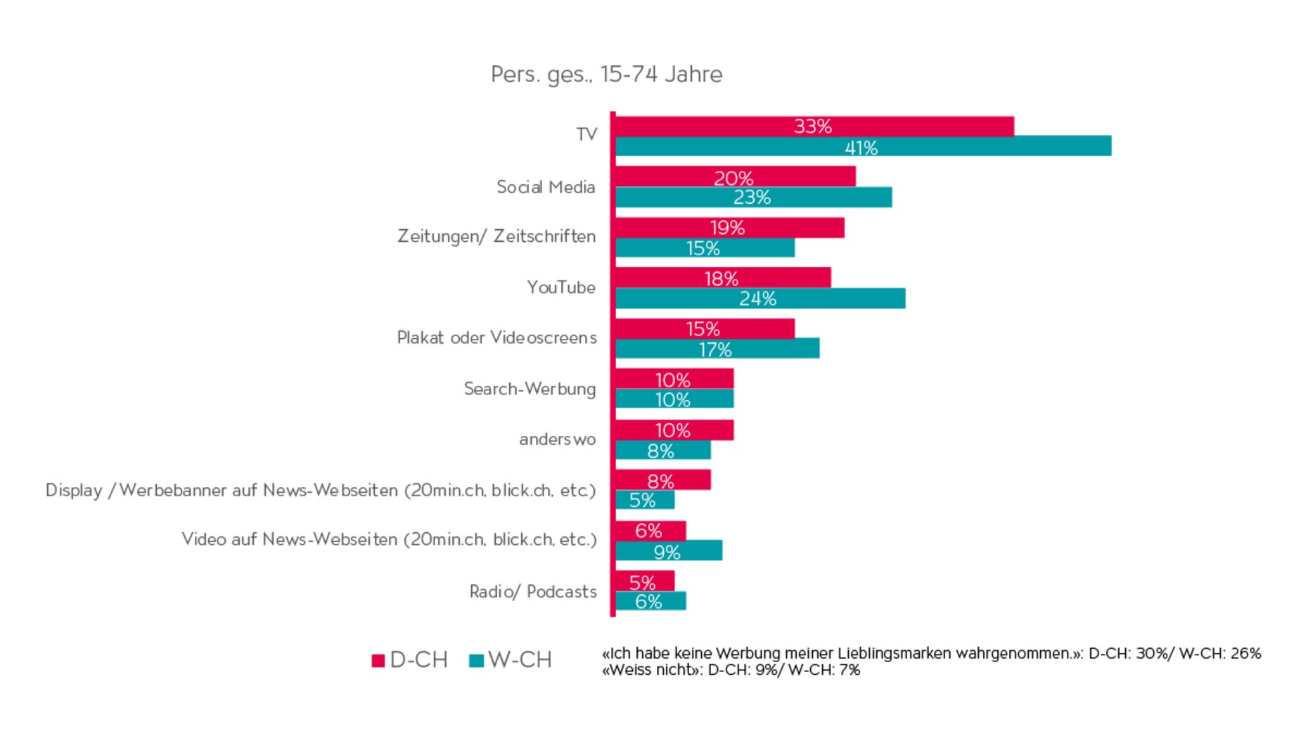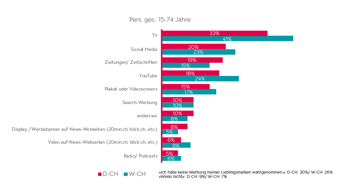 Doch auf welchem Kanal birgt eine Werbereduktion am meisten Risiko? Die Resultate der Studie zeigen die Stärken der einzelnen Mediengattungen auf. In der Deutsch- und Westschweiz wird die Werbung der Lieblingsmarken von mehr als einem Drittel der Menschen im TV wahrgenommen. Im Gegensatz dazu reihen sich Social Media, Zeitungen/Zeitschriften und YouTube mit einem deutlich geringeren Wert für Werbeerinnerung hinter TV ein (siehe Abb. 2).