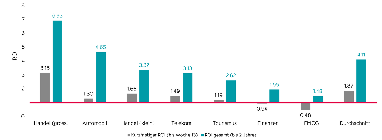 Der durchschnittliche, branchenübergreifende und kurzfristige Return on Investment (ROI) bis zur 13. Woche beträgt gemäss der UK-Studie £1.87, was bedeutet, dass für jedes investierte Pfund in Werbung ein Gewinn von £1.87 erzielt wird. Langfristig betrachtet steigt der branchenübergreifende, durchschnittliche Gesamt-ROI unter Berücksichtigung der nachhaltigen Effekte auf £4.11. Dies spiegelt das volle Gewinnvolumen, das sich durch die Werbemassnahmen langfristig entfaltet. Somit wird insgesamt ein Gewinn von £4,11 pro investiertem Pfund erzielt, was die Wirksamkeit und Rentabilität der Werbung nachhaltig bestätigt.