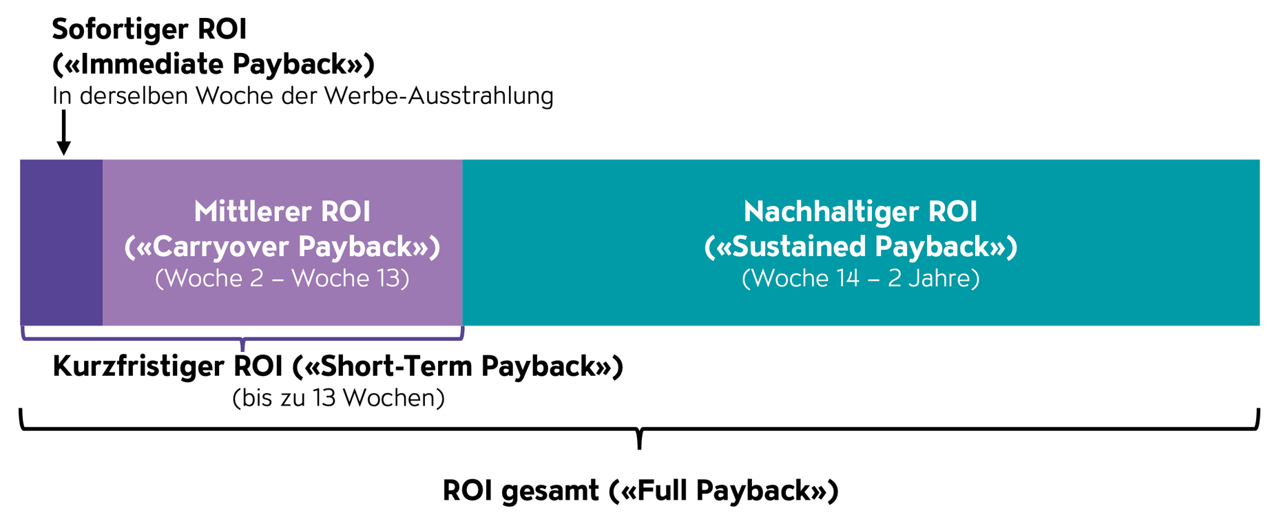 Der sofortige ROI (Immediate Payback) wurde noch in derselben Woche der Werbeausstrahlung gemessen. Der mittlere ROI (Carryover Payback) zwischen Woche 2 und 13 nach Ausstrahlung und der nachhaltige ROI (Sustained Payback) zwischen Woche 14 und 2 Jahren nach Ausstrahlung. So lässt sich ein Gesamt-ROI (Full Payback) innerhalb von 2 Jahren nach Werbeausstrahlung wie in Abbildung 1 strukturieren.