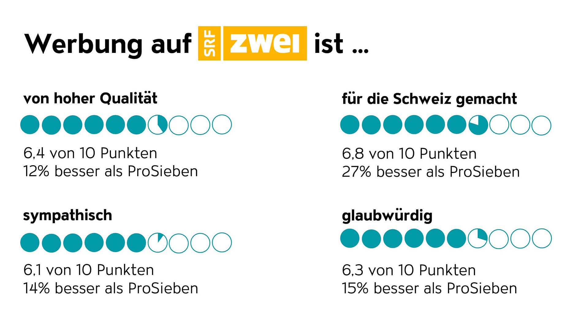 Auch die Werbung auf SRF zwei wird ausserordentlich gut bewertet. Der Qualität der Werbung auf SRF zwei geben die Befragten 6,4 Punkte, der Swissness 6,8 Punkte, der Sympathie 6,1 und der Glaubwürdigkeit 6,3 Punkte.
