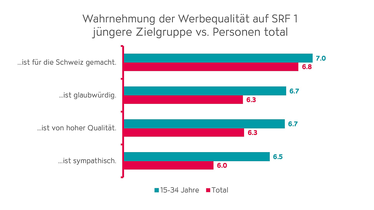 Gerade bei jungen Leuten erfreuen sich die Werbeplätze von SRF einer sehr guten Bewertung. Die Befragten im Alter von 15 bis 34 Jahren beurteilen die Werbung auf SRF 1 und SRF zwei in allen Qualitätsdimensionen noch eine Spur besser als das Total der befragten Personen (15-74 Jahre).