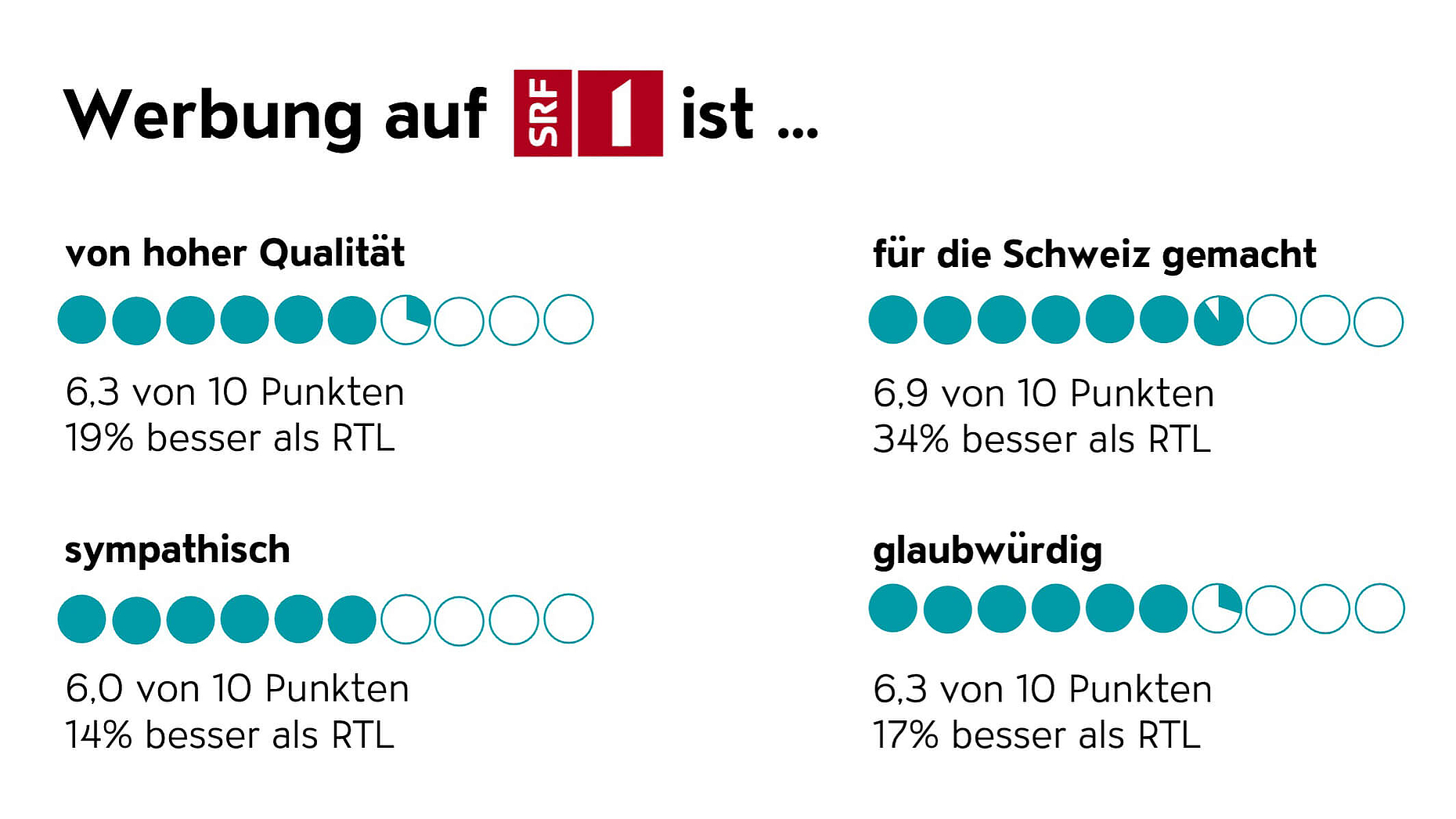 Die Resultate der Konsumentenumfrage bescheinigen den Sendern von SRF eine führende Position im Werbemarkt. Auf SRF 1 wird die Qualität der Werbung auf einer 10er-Skala mit 6.3 Punkten bewertet. Für die Swissness der Werbung werden 6.9 Punkte, für die Sympathie 6 Punkte und die Glaubwürdigkeit 6.3 Punkte vergeben (siehe Abb. 2). Weitere Qualitätsdimensionen sind im Studien-Paper (siehe unten) einsehbar.