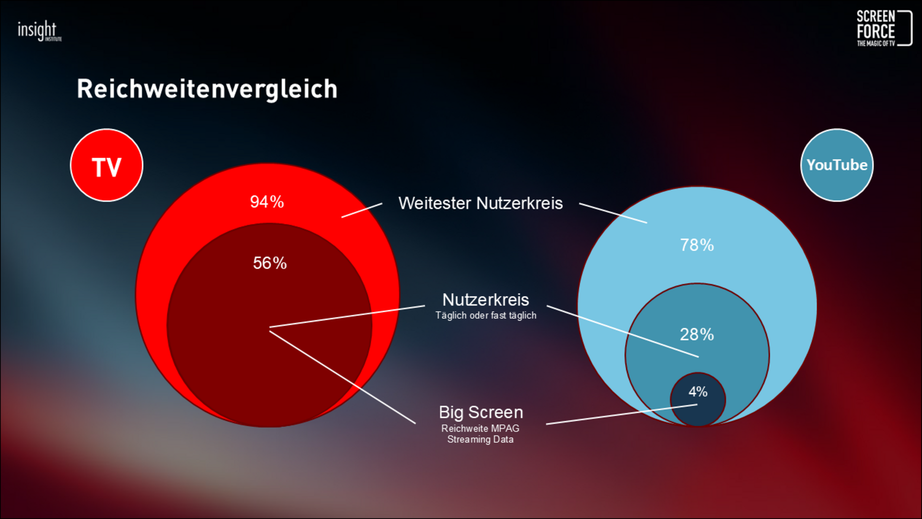 Screenforce wollte das genau wissen und zog den IGEM DigiMonitor 2024 und den Mediapulse Streaming Data Q4 2024 Report zu Hilfe. Schnell wird klar: Die Befragten sprechen vom weitesten Nutzerkreis – hier erreicht YouTube 78%, TV liegt bei 94%. Beim täglichen Nutzerkreis ändert sich das jedoch – YouTube liegt da bei 28%, TV bei 56%. Und bei der täglichen Reichweite auf dem Big Screen – entscheidend für die Werbewirkung, dazu später – kommt YouTube gerade einmal auf 4%, TV hingegen auf 56%.