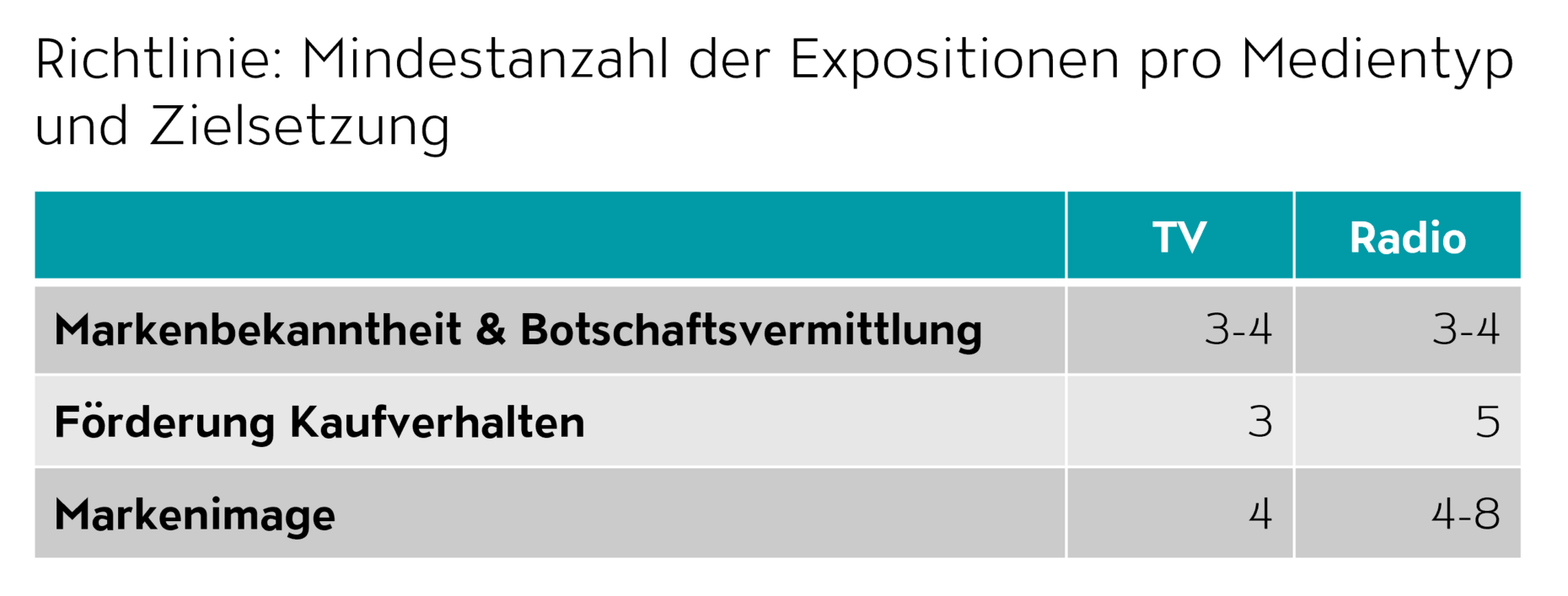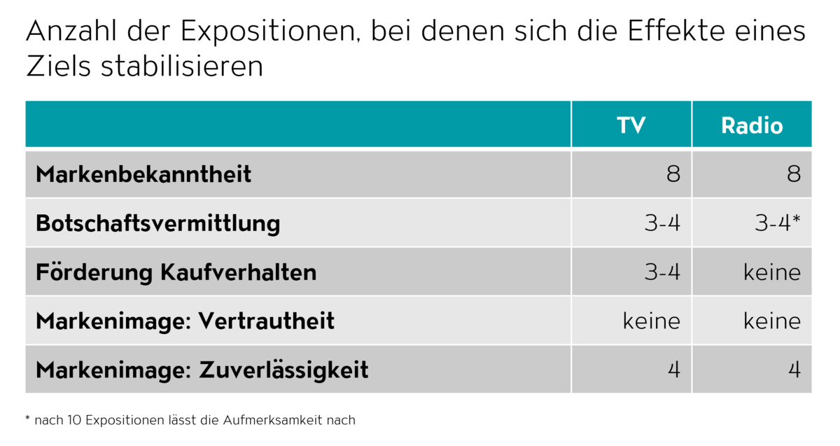 Während bereits eine Einblendung wirkt, sind für die meisten TV- und Radiospots drei bis vier Kontakte für einen «Wear-in» nötig. Das heisst, ein Spot muss die Zielgruppe oft genug erreichen, damit sie die Botschaft verstehen und positive Assoziationen zur Marke aufbauen können. Kampagnenziel und Medientyp beeinflussen die benötigte Anzahl an Einblendungen. Fernsehen eignet sich, um schnell Kaufverhalten anzuregen oder das Markenimage zu stärken, da es weniger Kontakte als Radio erfordert. Bei längeren Kampagnen kann Radio eine effektive und kostengünstige Ergänzung zu TV sein.