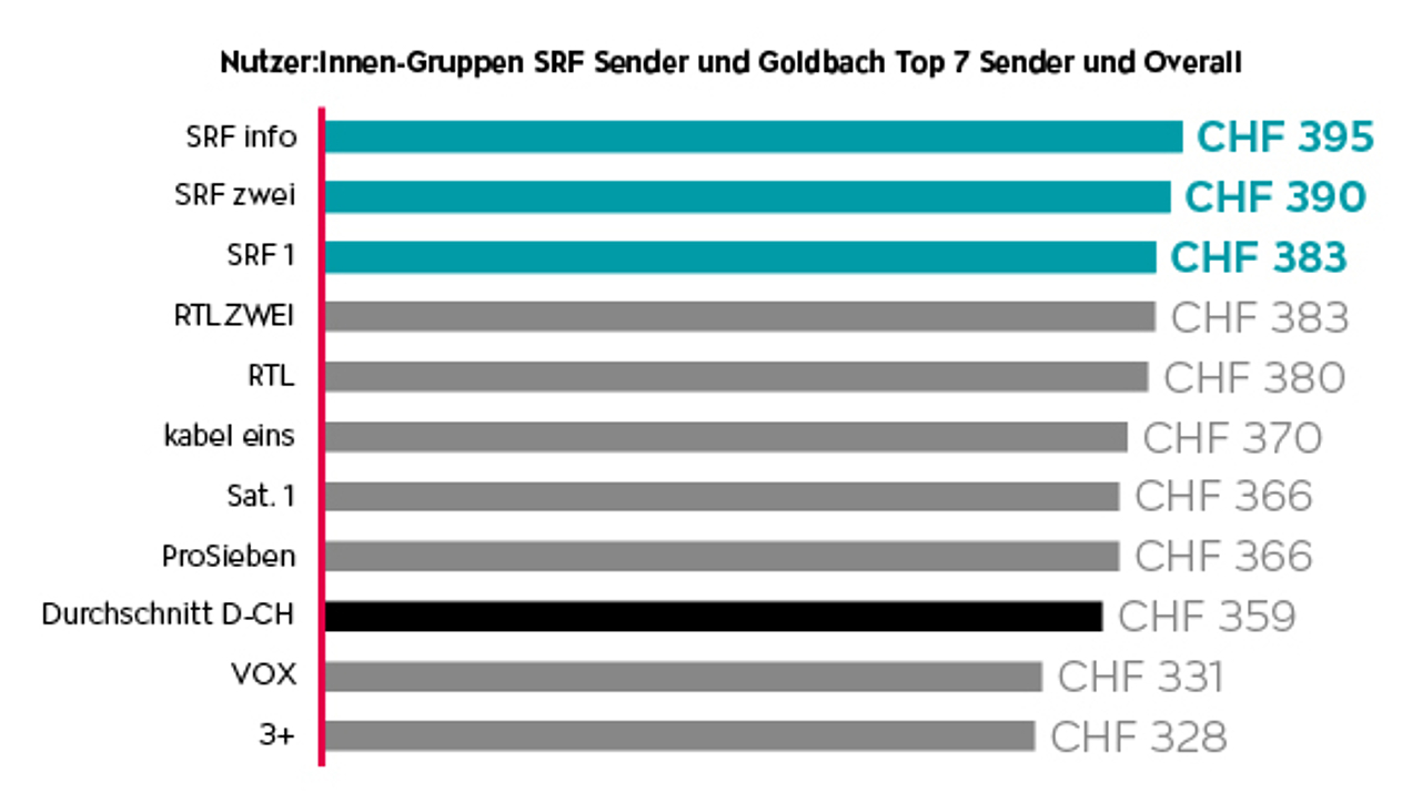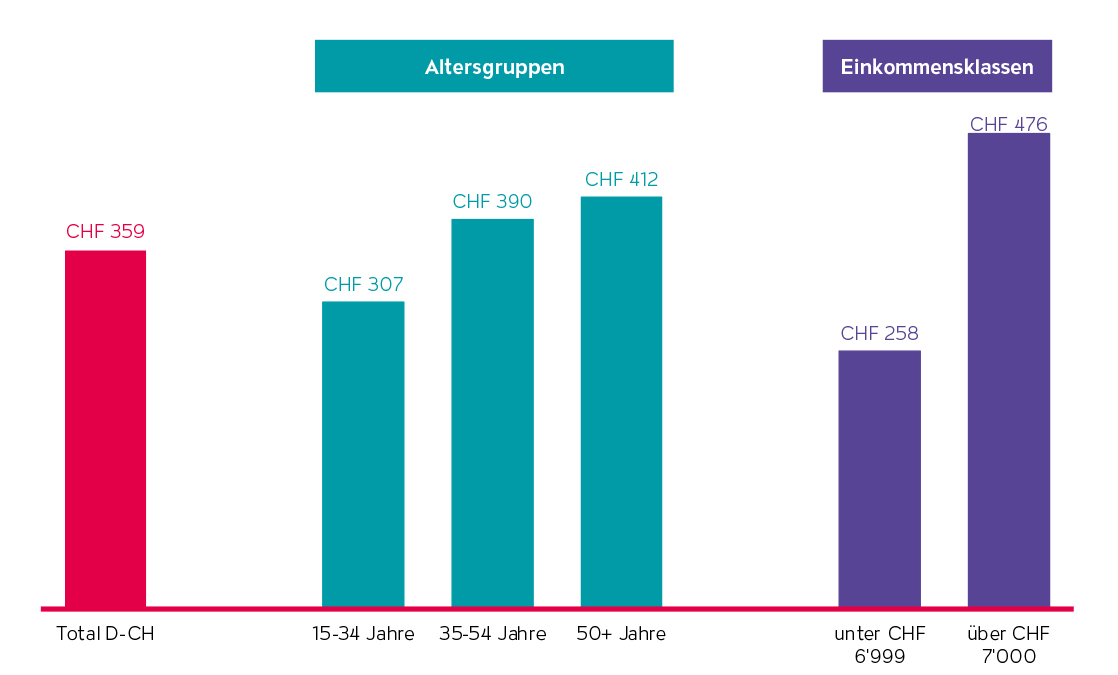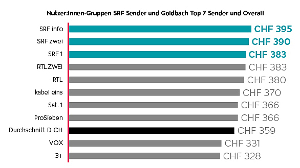 Neben den überzeugenden Reichweiten der SRF Sender, die es ermöglichen, ein riesiges Potential anzusprechen, kommt eine psychologische Qualität hinzu. Denn gerade das Publikum der SRF Sender spricht sehr auf gesehene TV-Werbung an und lässt sich durch Werbespots für Weihnachtsgeschenke inspirieren (s. Abb. 3). Zudem liegt auch das eingeplante Weihnachtsbudget bei den Zuschauer:innen der SRF Sender über dem Durchschnitt von 359 CHF (s. Abb. 4).