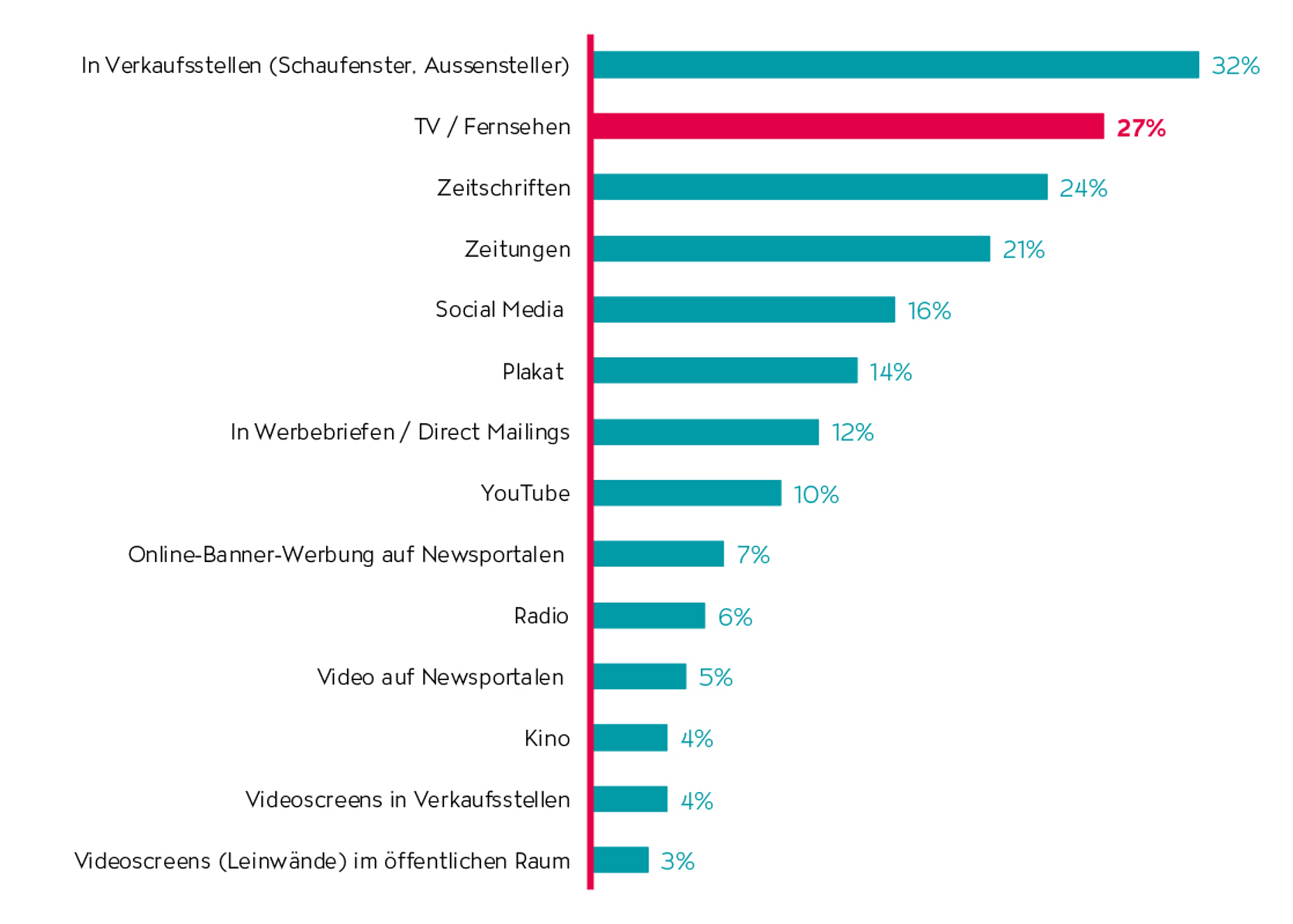 Insbesondere TV-Werbung sticht hier als die mit Abstand grösste mediale Inspirationsquelle hervor und wird von 27% der Proband:innen genannt (s. Abb. 2). Dieser Wert hat im Vergleich zum Vorjahr 2022 einen Anstieg von 5% verzeichnet.